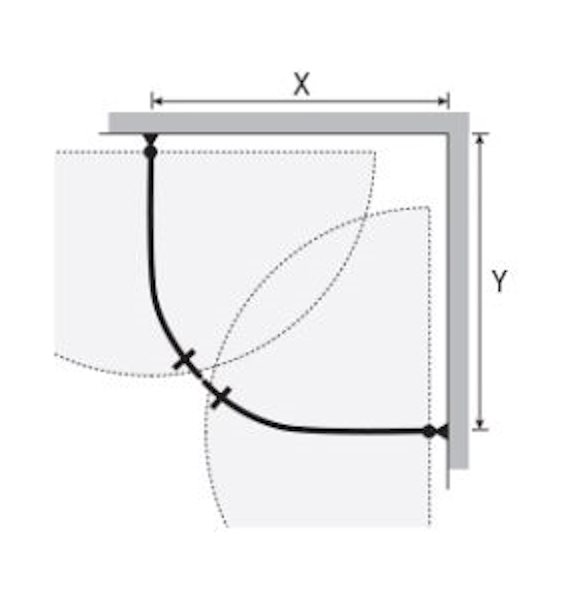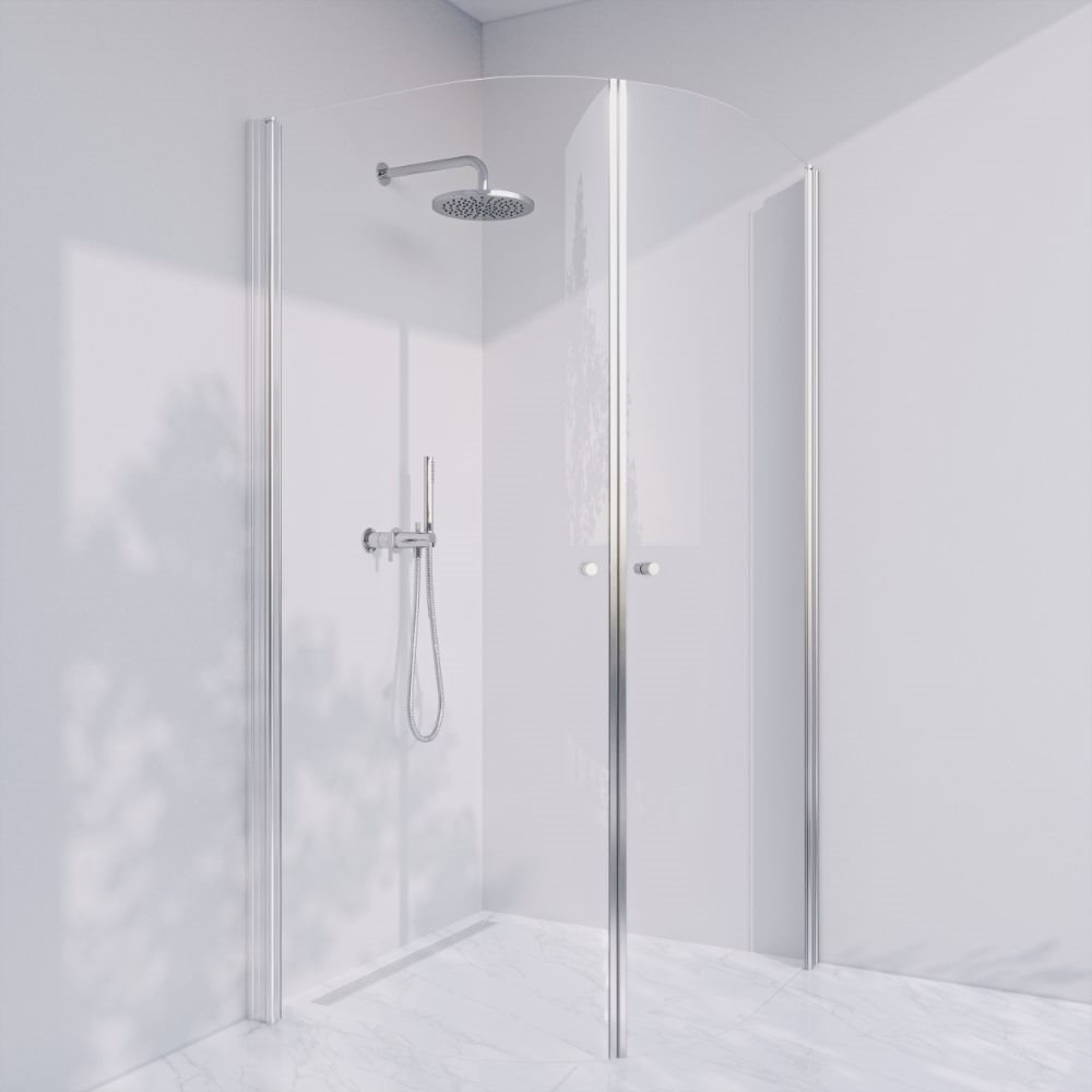 Brusehjørne fra Prime-serien består af en dobbelt glasdør begge i buet glas. Dørbladene er monteret med vedligeholdelsesfrie løftehængsler, så dørene bliver løftet 5 mm, når de åbnes. Glasset er monteret i slanke aluminium vægprofiler. Aluminiumsprofilerne er af høj kvalitet og de kommer med ekstra borehuller, så de kan sidde ekstra godt fast i væggen, og skabe en stabilitet i brusekabinen der holder hele brusekabinens levetid. Glasset i brusekabinen er 6 mm klart hærdet sikkerhedsglas.