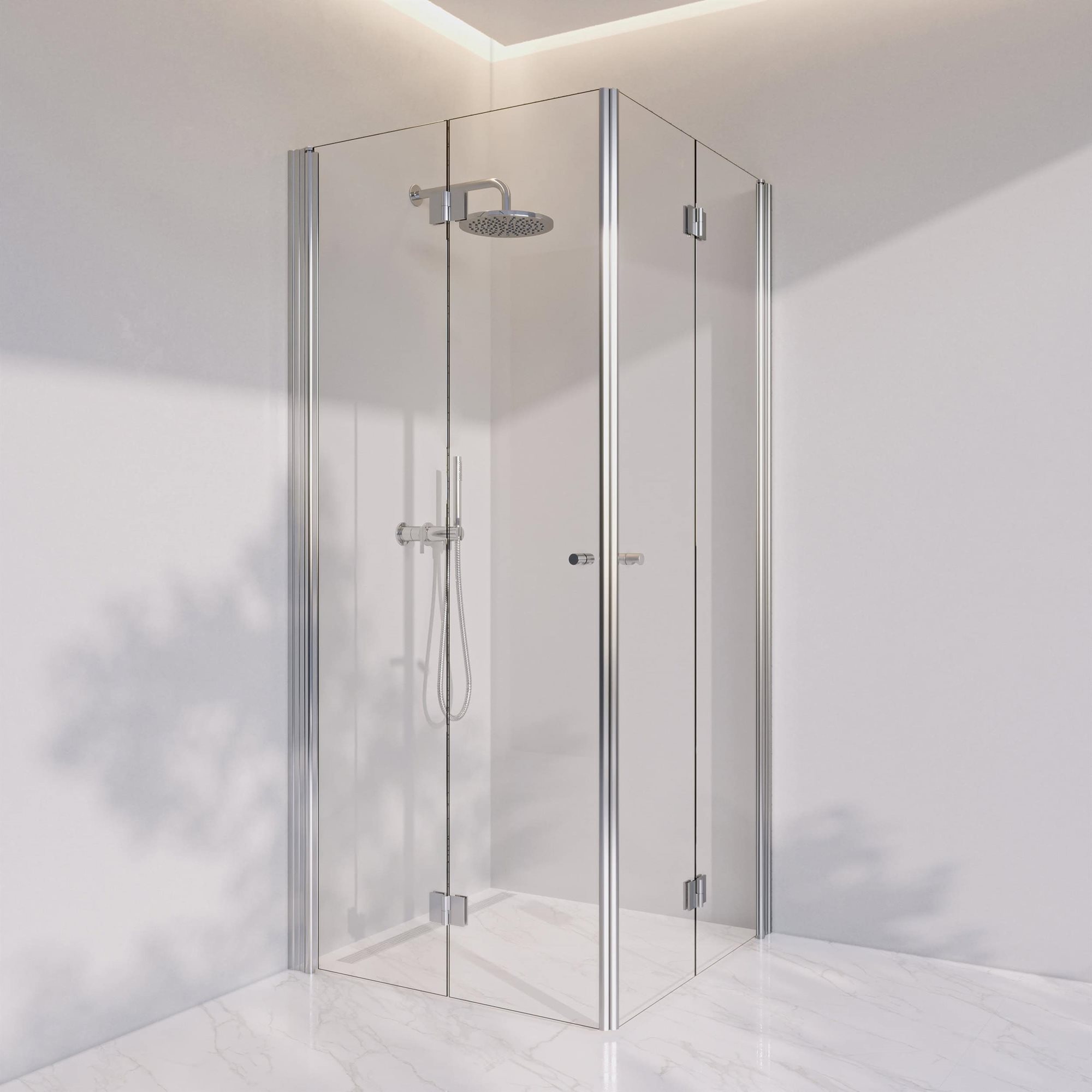 Brusehjørne fra Prime-serien består af to lige foldedøre og tager minimal plads. Dørbladene er monteret med vedligeholdelsesfrie løftehængsler, så dørene bliver løftet 5 mm, når de åbnes. Glasset er monteret i slanke aluminium vægprofiler. Aluminiumsprofilerne er af høj kvalitet og de kommer med ekstra borehuller, så de kan sidde ekstra godt fast i væggen, og skabe en stabilitet i brusekabinen der holder hele brusekabinens levetid. Glasset i brusekabinen er 6 mm klart hærdet sikkerhedsglas.