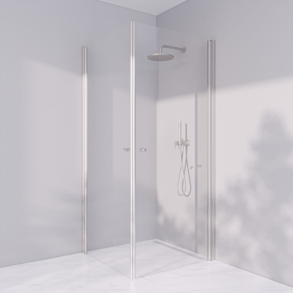 Brusehjørne fra Prime-serien består af en dobbelt glasdør. Dørbladene er monteret med vedligeholdelsesfrie løftehængsler, så dørene bliver løftet 5 mm, når de åbnes. Glasset er monteret i slanke aluminium vægprofiler. Aluminiumsprofilerne er af høj kvalitet og de kommer med ekstra borehuller, så de kan sidde ekstra godt fast i væggen, og skabe en stabilitet i brusekabinen der holder hele brusekabinens levetid. Glasset i brusekabinen er 6 mm klart hærdet sikkerhedsglas.