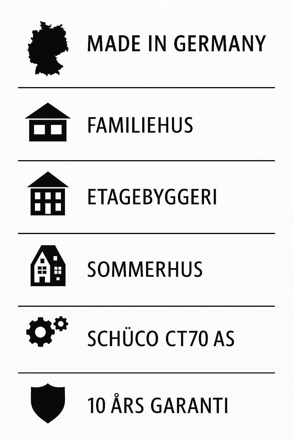 Schüco CT 70 AS-systemet er kendt for sin fremragende varmeisolering og lydreduktion. Med et 5-kammer profilsystem og høje tætningsværdier får du et vindue, der holder varmen inde og støjen ude – ideelt til både parcelhuse, lejligheder og kontorer.