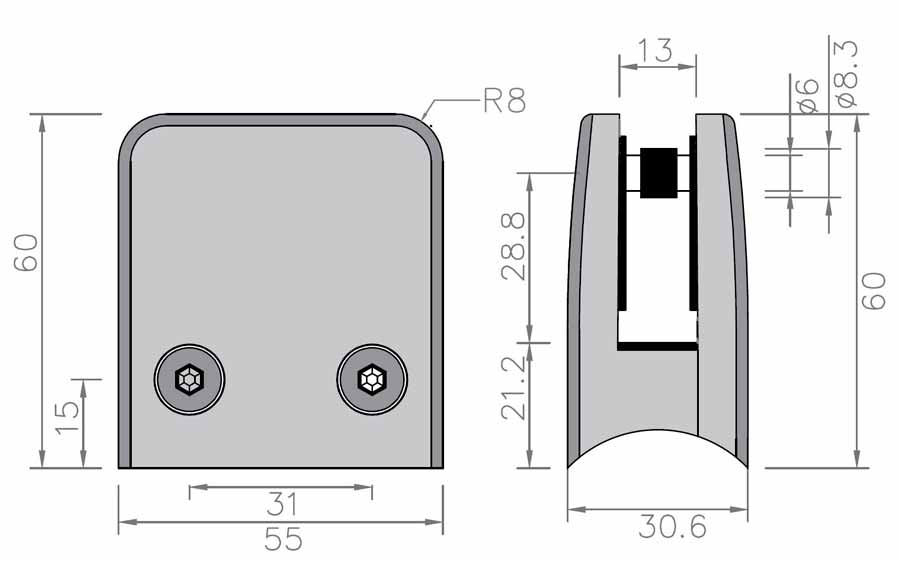 Glasklemme til montage på rør med Ø 42,4 mm fremstillet i Duplex 2205 rustfrit stål, hvilket betyder at den er ekstremt holdbar og bl.a. kan anvendes til rækværk ved havet og i svømmehaller.