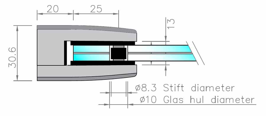 Glasklemmen er mat sort og kan tilpasses 6 - 12,76 mm glas alt efter gummipakning.