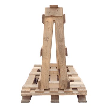 A-formet glasstativ i træ fra ASAWOOD til transport og opbevaring af glas og plader, den er bygget på en palle således at den kan tages med palleløfter og flyttes.